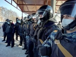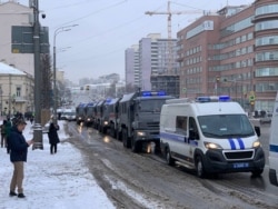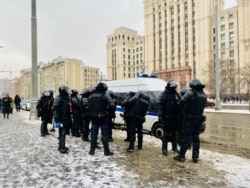 Сотрудники Росгвардии выстроились в цепь на остановке общественного транспорта. Заставляют участников уезжать по домам, еще одного задержали.