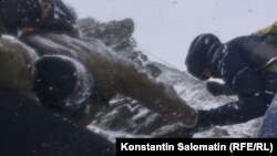 Лавиноопасные овраги мы проходим по очереди на большом расстоянии друг от друга, чтобы минимизировать возможные потери. Магомед идет первым и время от времени наносит деревянной палкой удары по сугробам, как бы провоцируя сход небольшой лавины, чтобы избежать более крупной. Спустя шесть часов мы оказываемся у подножья горы, на которой стоит станция, и начинается скалолазание – по камням приходится карабкаться, цепляясь за выступы и за тонкий металлический трос, который метеорологи установили в 1970 году после того, как два сотрудника погибли под лавиной. Подъем по хребту, где не так много снега, считается менее опасным. Все равно это очень страшно: трос колеблется и скользит, обледеневшие камни шатаются под ногами, ветер превращается в ураган, в лицо летит снег.