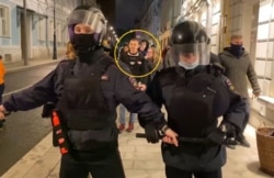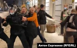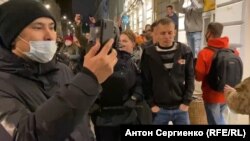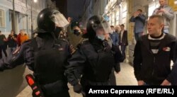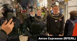 Около 9 вечера голова колонны протестующих достигла перекрестка Рождественского бульвара с Малым Кисельным переулком. Здесь и развернулись события, которые показались нам подозрительными. На видео корреспондента Радио Свобода Антона Сергиенко попали сразу несколько странных эпизодов. Его полная версия в нашем плеере – это два склеенных друг с другом куска длительностью 59 и 22 секунды, снятые практически один за другим: