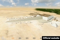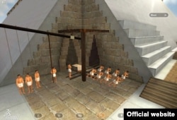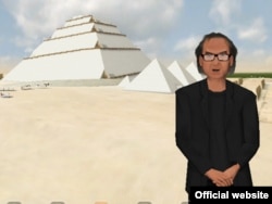 Автопортрет Жана-Пьера Удена на фоне пирамиды. Кадр из трехмерной реконструкции. Система трехмерного моделирования Dassault Systèmes позволила показать, что пирамида могла быть построена с помощью внутреннего пандуса, который шел по граням пирамиды и был достаточно пологим и длинным, чтобы можно было внутри поднимать каменные блоки.
