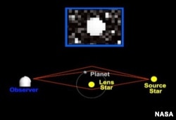 Реконструкция. Планета, обнаруженная методом микролинзирования на расстоянии 17 тысяч световых лет от Земли в созвездии Стрельца. Звезда-источник находится на расстоянии 24 тысячи световых лет. «Астрономия с малыми телескопами»