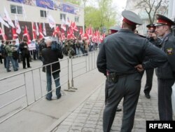 Под государственным гербом на фасаде эстонского посольства в Москве явственно просматривается коричневое пятно, оставшееся от вчерашнего «обстрела», хотя кое-где следы отчищали вместе со штукатуркой. Несколько десятков представителей «Молодой гвардии» и «Наших», сменяя друг друга, дежурят в пикете у нарисованного на бумаге таллинского памятника Воину-освободителю. В руках у них плакаты «Вторая мировая война продолжается! Фашизм угнездился в Эssтонии», «Прихвостни НАТО, руки прочь от русского солдата!». Пикетчики скандируют «Эстонские дебилы, прочь от нашей могилы!» и «Фашизм не пройдет!». К середине дня у посольства появился «козлик» с эмблемой ЛДПР и несколько человек с бело-голубыми флагами присоединились к митингующим. Пока разрешенный до 17 часов пикет проходит без эксцессов, но к посольству стягивается ОМОН, видимо, в ожидании обещанной вечером акции ДПНИ.