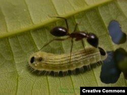 Муравей, введенный в заблуждение запахом, охраняет личинку голубянки