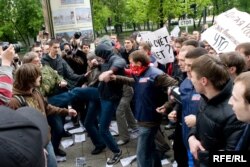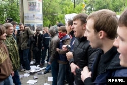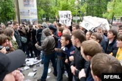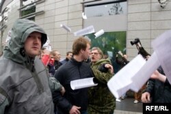 Через 20 минут, с другой стороны подошла группа молодых людей в куртках «Молодой гвардии». Они раскидывали листовки...