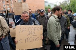 А через несколько минут подтянулись люди неопрятного вида и неприятного запаха с самодельными плакатами в поддержку Каспарова.