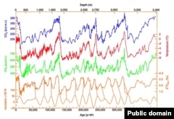 График исследования ледяного керна на станции «Восток». Наверху над графиками отложена глубина в метрах, внизу – время в годах. Синим – изменение концентрации углекислого газа CO2, красным – изменение температуры. Пики красной линии на графике – моменты максимальных потеплений.