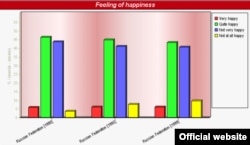 Диаграмма показывает чувство счастья по опросам в РФ за 1990, 1995, 1999 годы. Красным обозначен процент ответивших «счастлив», зеленым – «скорее счастлив», синим – «скорее несчастлив», желтым – «несчастлив». 1998 году России была в числе трех самых несчастных стран мира. Диаграмма составлена исследовательской программой World Values Survey