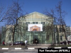 Дом культуры: под свежей сеткой и табличкой, сообщающей о реконструкции, бордюрный камень покрашен, установлен забор: