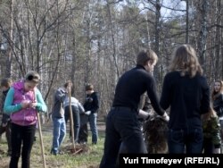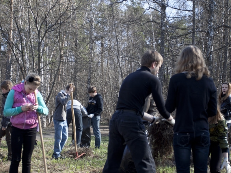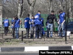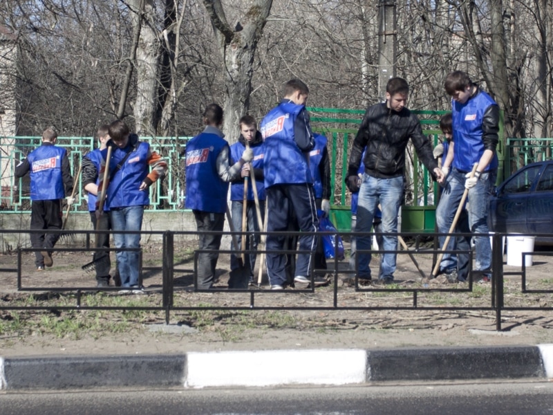 У поворота на проходную завода с разной степенью энтузиазма школьники и молодогвардейцы убирают листья, ветки деревьев и прочий мусор: