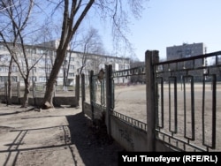 Забор школы со двора, где президент его скорее всего не заметит, оставили старый, но все же на сто метров от маршрута покрасили: