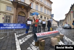 Активисты в Праге 27 января организовали пикет у посольства Германии, чтобы высказать критику немецкой политики в отношении России.