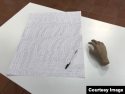 – Я начал его 6 декабря, уже находясь во Франции. Он экзистенциальный и психотерапевтический в каком-то смысле. Сублимирующий, так сказать, мое самое большое желание. Я пишу фразу "Я хочу, чтобы кончилась война" на больших листах, стараюсь делать это каждый день. Использую несколько языков – обязательно английский, русский и украинский, также добавляю языки тех стран, где я нахожусь. Уже были французский, немецкий, армянский, иврит, чешский. Иногда я включаю в эти работы графику. Сейчас сделано уже больше ста листов. Проект не случайно называется "Время войны". Это визуализация времени. Желание, выраженное в этой фразе, – некий бесконечный фон. У тебя в голове свербит эта фраза, но ты не можешь ничего сделать, только пишешь и пишешь ее, тратишь на это уйму времени. Может быть, это глупое занятие, но оно психологически помогает хоть как-то выразить это чувство. Вообще, это характерно для моей практики как художника – работать на повторе, делать какие-то длительные темпоральные вещи. Проект выставлялся уже в нескольких местах, во-первых, в маленькой галерее в Париже, потом я ездил с ним в Гаагу, потом в резиденцию в Брно. Также я показываю хлебные скульптуры, которыми я продолжаю заниматься. Не так давно я начал серию "Кубики". Это кубы, сформированные из человеческих фигур – люди стоят плотными рядами, как солдаты, которых построили в каре, и такого же размера кубики, сделанные из земли. В Женеве я решил еще показать видеодокументацию двух старых перформансов, которые так или иначе имеют отношение ко времени, к человеческим страданиям – "По кругу" и "Основной вопрос".