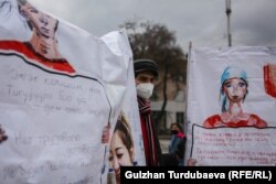 Бишкек, Киргизия, 8 марта. Марш "За права женщин", приуроченный к Международному женскому дню. Сначала на участников марша напали неизвестные, а затем милиция задержала десятки его участников и организаторов. Задержанных участников марша, а также журналистов увезли на автобусах в ОВД. Причину задержания им не объяснили. Фото – Гюльжан Турдубаева, RFE/RL.