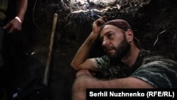 Денис, украинский военнослужащий, работавший до начала российского вторжения археологом и учителем, отдыхает во время небольшого перерыва, воюя в составе минометного подразделения на передовых позициях в Донецкой области 29 августа. Фоото – Сергей Нужненко, RFE/RL.
