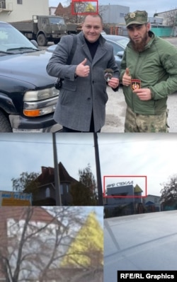 На одном из видео, которое было выложено 29 ноября, Синявский передает гуманитарную помощь бойцу спецназа полка имени Ахмата Кадырова и обменивается с ним шевронами. Радио Свобода удалось геолоцировать точку передачи гуманитарной помощи – это место во дворе кафе "Цитадель" на юго-западе Мелитополя. На снимке с обменом шевронами можно увидеть в этой точке два загруженных лесом российских военных грузовика.
