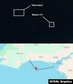 Место атаки на ракетный крейсер Ивановец было геолоцировано с помощью видео ГУР и благодаря спутниковому снимку, на который попал дымящийся после взрыва "Ивановец" и один из атаковавших его надводных дронов. Корабль был подбит в 12 километрах от озера Донузлав, где базируются ракетные катера этого типа, и менее чем в 8 километрах от прибрежного крымского села Окуневка, что совпадает с данными российских "военкоров".