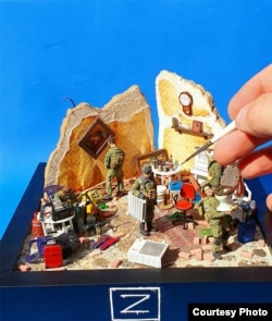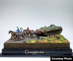 Живущий в Англии литовский художник Томас Упскас делает миниатюрные диорамы с политическими и историческими сюжетами. "Я изображаю солдат-мародеров не в первый раз, – рассказывает он Радио Свобода. – У меня была диорама с советскими мародёрами в Литве в 1944 году".