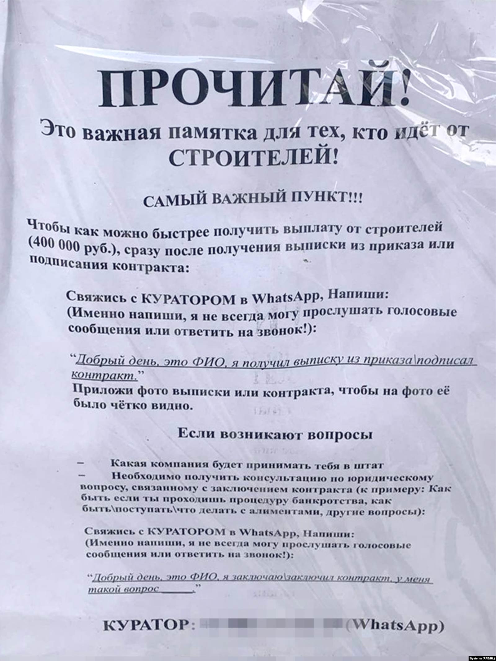 По такой схеме рекрутов набирают как государственные, так и частные организации, выяснила "Система". Например, по квоте "от дорожных компаний" набирает контрактников питерское ГБУ "Центральное управление региональных дорог и благоустройства" – об этом рассказал один из вербовщиков. А название еще одного участника системы рекрутинга на войну, крупнейшей строительной фирмы Петербурга, сказал "Системе" человек, которого называют "куратором" схемы – он отвечает уже непосредственно за взаимодействие новобранцев со строительными фирмами. Его номер не указан в объявлениях о наборе – контакт куратора дают тем, кто уже прибыл на первоначальную точку сбора. "Система" узнала его телефон благодаря фотографии инструкции для новобранцев, полученной от источника, который собирался отправиться на войну по схеме "от строителей".