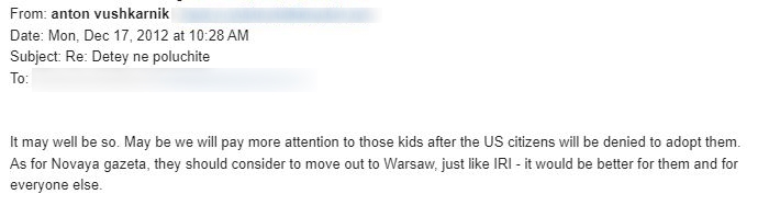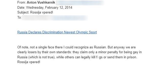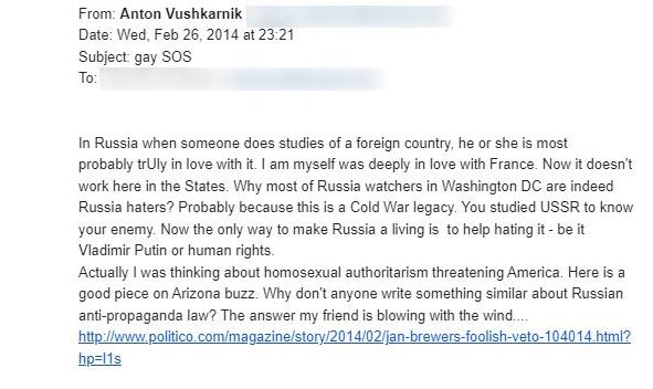 В распоряжении Радио Свобода оказались имейлы, которые Антон Вушкарник посылал Кайлу Паркеру, сотруднику хельсинкской комиссии США в 2012–2014 годах. В одном из писем он пишет, что участницы феминистской панк-рок-группы Pussy Riot, получившие тюремные сроки за антипутинскую акцию в московском храме, "просто недовольны своей сексуальной жизнью" и "им просто надо пое*аться". Однако "такого приговора в нашем уголовном кодексе, увы, нет", добавляет Вушкарник.