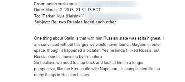 Писал Вушкарник Паркеру и о Сталине: "При Сталине российское государство достигло небывалых вершин. Я убежден, что без него мы бы не отправили Гагарина в космос, пусть даже это случилось уже потом. Сталин, конечно, вые*ал Россию, но у русской души женская природа".