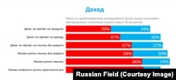 – Мы используем шкалу от "денег не хватает на продукты" до "можем позволить себе купить практически все", между ними еще "денег не хватает на одежду", "не хватает на бытовую технику без кредита" и так далее. Важно понимать, что эта шкала не говорит о каком-то фиксированном доходе. "Денег не хватает на продукты" не значит, что человек зарабатывает меньше 10 тысяч рублей. А "можем позволить себе абсолютно все" не значит, что человек зарабатывает от миллиона рублей в месяц. Эта шкала говорит об удовлетворенности своим доходом, в первую очередь. Категория "денег не хватает на продукты", безусловно, бедная, но категория "можем позволить купить себе практически все" – не всегда супербогатая. Еда может быть из "Магнита", а может из "Азбуки вкуса", квартира может быть разная, машина может быть разная, бытовая техника. Скорее, это бедные и богатые по самовосприятию. Бедные, малообеспеченные люди в меньшей степени поддерживают военную операцию – это абсолютно так. Мы вообще заметили корреляцию рейтинга Путина с рейтингом социального самочувствия и поддержкой военной операции, это практически одни и те же показатели. Малообеспеченные люди в меньшей степени довольны положением дел, что в Москве, что в регионах. Они менее позитивно оценивают действия власти, и федеральной, и региональной, и муниципальной. Малообеспеченные группы в меньшей степени поддерживают военную операцию по сравнению с обеспеченными людьми. А обеспеченные, те, кто могут позволить себе "абсолютно все" или какие-то блага, которые недоступны другим, – это скорее группа, которая просто довольна своим доходом. Это не говорит о богатстве, это говорит о том, что людям жить хорошо, комфортно. А тем, кто говорит, что у них не так много денег, жить менее комфортно. Если у человека меньше денег, он меньше доволен всем, что происходит, начиная от ситуации в его дворе и заканчивая военными действиями, которые сейчас идут.