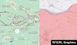 На коллаже ниже слева в белом круге – место, где сделан опубликованный Рустемом Темиркаевым снимок, на карте российских укреплений, составленной пользователем твиттера Брэди Аффриком. Справа – этот же район на карте боевых действий и контроля украинской территории сторонами конфликта Liveuamap.com.