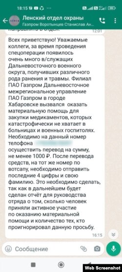 В распоряжении Радио Свобода оказался скриншот сообщения в мессенджере WhatsApp из чата сотрудников Ленского отдела охраны ПАО "Газпром" в Республике Саха (Якутия). В нем сотрудников компании обязывают перечислить 1000 рублей на помощь военным, раненным во время "специальной военной операции", потому что в местных больницах и госпиталях "катастрофически не хватает медикаментов".
