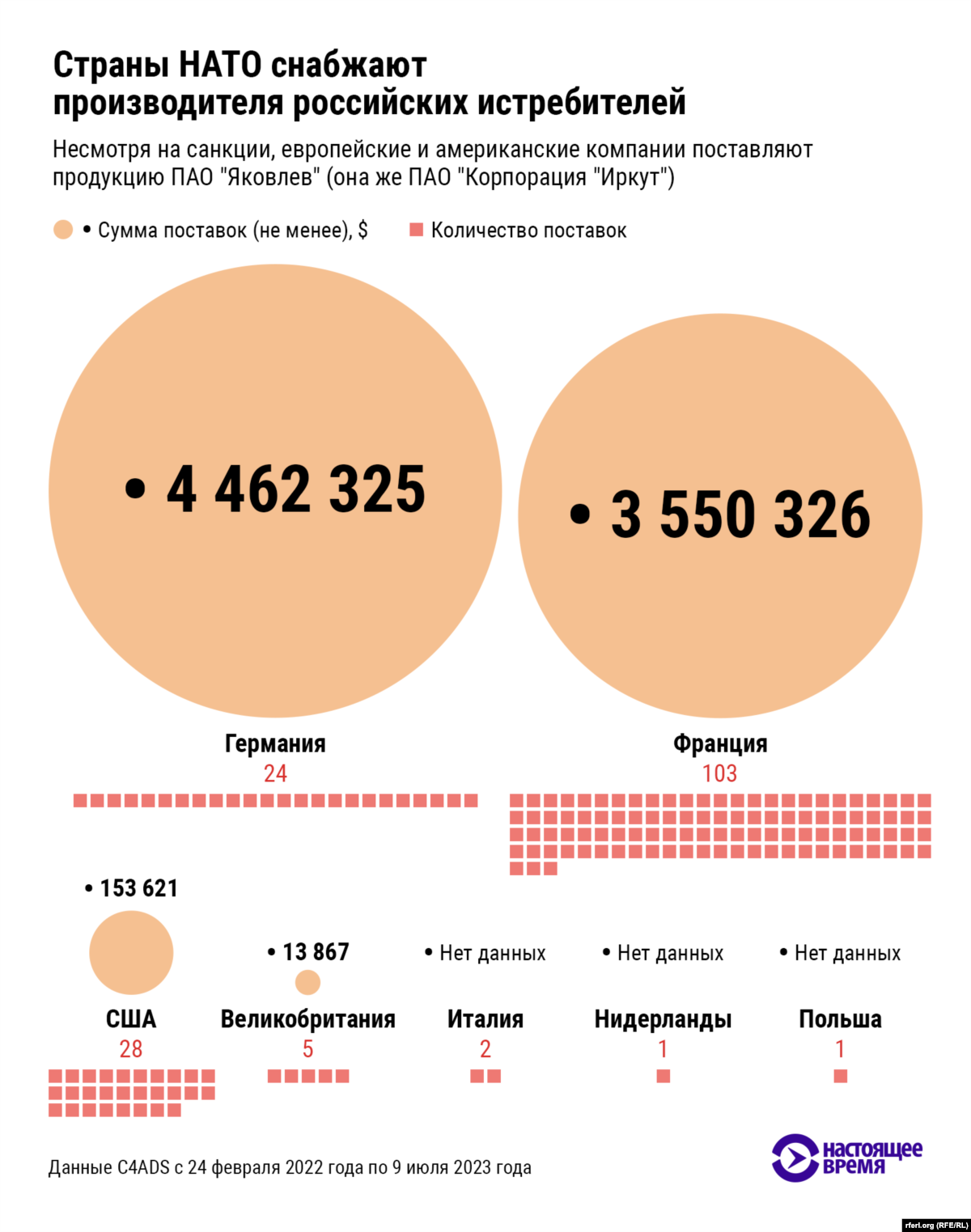 Компании из Франции, Германии, США и ряда других стран НАТО продолжают поставлять в Россию запчасти и детали для разработки и производства самолетов. Американская некоммерческая организация C4ADS, занимающаяся сбором и анализом информации в сфере обороны, предоставила "Системе" таможенные данные импорта ПАО "Яковлев" (она же ПАО "Корпорация "Иркут") за 2022 и 2023 годы, из которых следует, что общая стоимость этих поставок превысила восемь миллионов долларов.