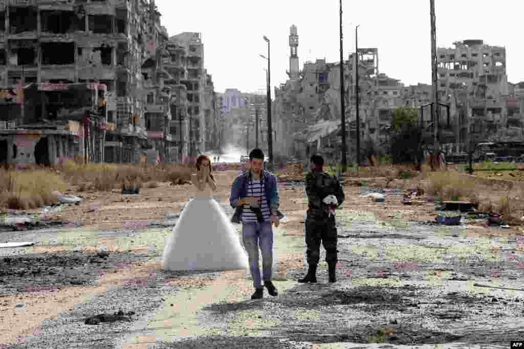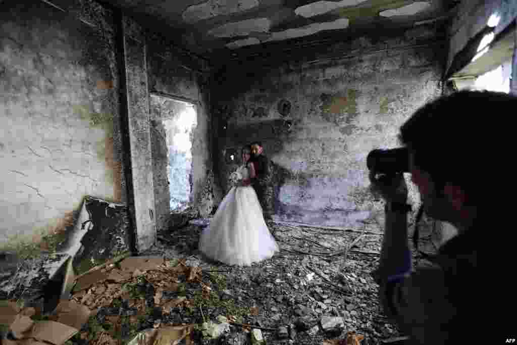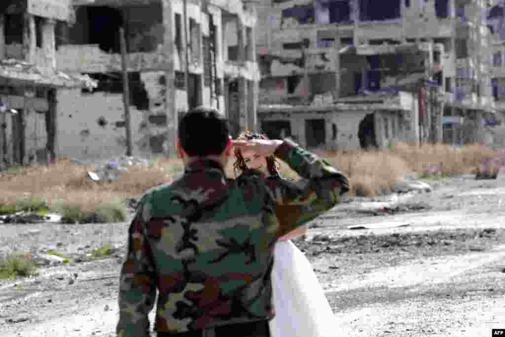 За пять лет войны в Сирии город Хомс превратился в сплошные развалины. Сейчас Хомс находится под контролем сирийской оппозиции, авиация Башара Асада, а также российские ВВС регулярно бомбят город. Но жизнь в Хомсе продолжается. Фоторепортер агентства AFP запечатлел свадьбу 18-летней Нади и 27-летнего Хасана. Она состоялась 5 февраля.