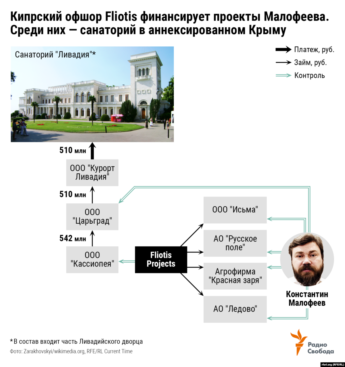 Мы начали распутывать этот клубок с покупки Малофеевым крымского санатория "Ливадия" в 2018 году. Любимое место отдыха царской семьи, которое после аннексии Крыма отошло пророссийским властям, обошлось монархисту в полмиллиарда рублей. Из отчетности следует, что сделку профинансировал кипрский офшор Fliotis Projects. Этот же офшор не раз кредитовал и другие проекты Малофеева.