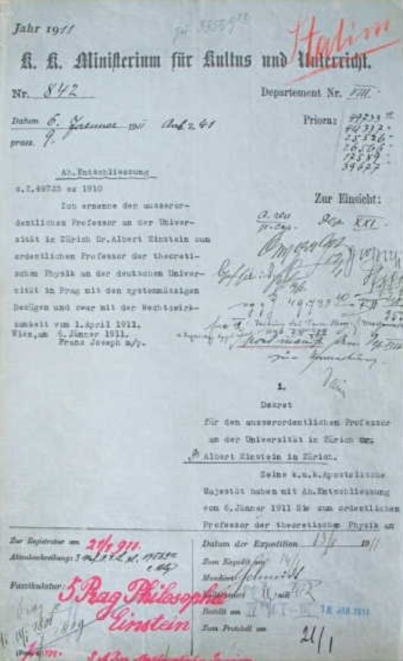 Первая страница декрета министерства культуры и образования от 6.1.1911, подписанного императором Францем Иосифом I о назначении Альберта Эйнштейна профессором теоретической физики в Немецком университете Праги с 1.4.1911