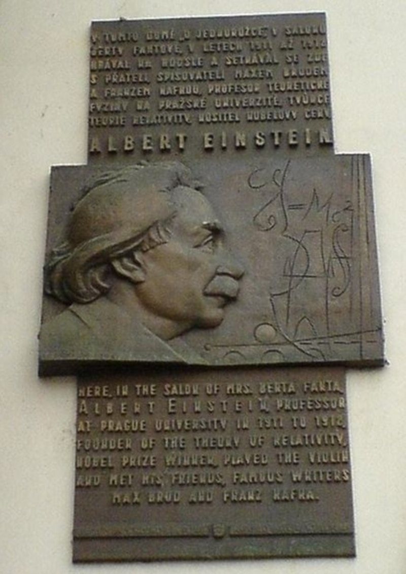 Табличка на одном из зданий Староместской площади Праги, гласящая: «Здесь, в салоне госпожи Берты Фанты, Альберт Эйнштейн, профессор Пражского университета с 1911 по 1912 год, основатель теории относительности, нобелевский лауреат, играл на скрипке и встречался с друзьями, знаменитыми писателями Максом Бродом и Францем Кафкой»