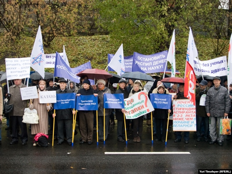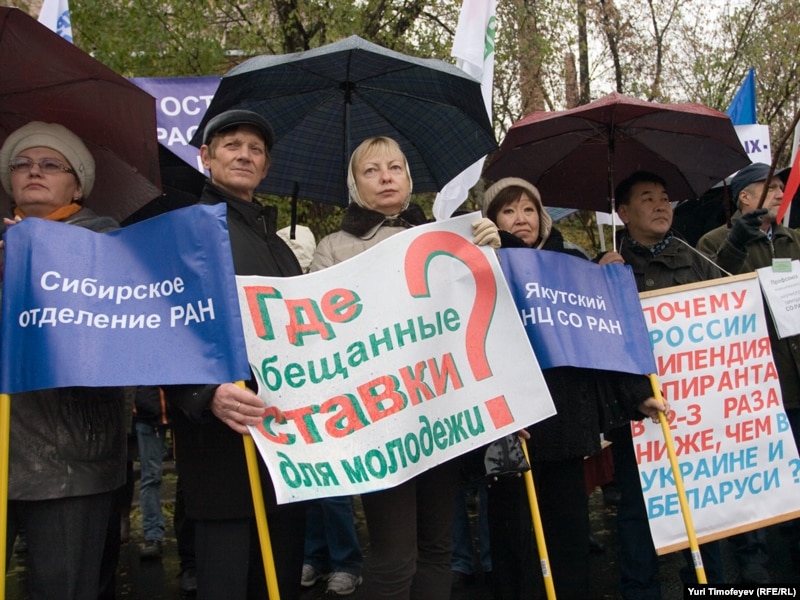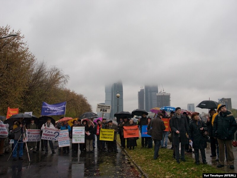 Проливной дождь не помешал сотрудникам Российской академии наук из двух десятков регионов собраться в Москве на митинг с требованием увеличить финансирование науки. Правда, акцию им разрешили провести в месте глухом, практически безлюдном – на Нижней набережной Тараса Шевченко.