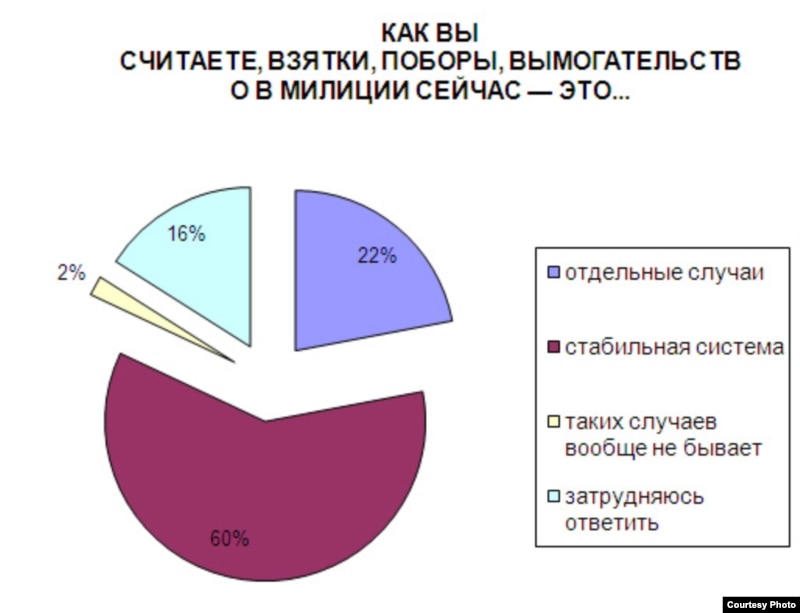 – Конечно, они сохраняются. Когда мы напрямую спрашиваем людей, верят ли они в то, что милиция их защитит, они демонстрируют очень низкий уровень доверия к милиции. Подавляющее большинство (60%) считает, что милиция работает на обеспечение своих собственных интересов, и только 24% - что милиция работает на обеспечение безопасности населения. По другим нашим исследованиям, люди прибегают к помощи милиции как к крайней мере, когда другого способа защититься нет. Надежды на то, что милиция будет стоять на стороне потерпевшего, вникать в его проблемы, довольно призрачные.